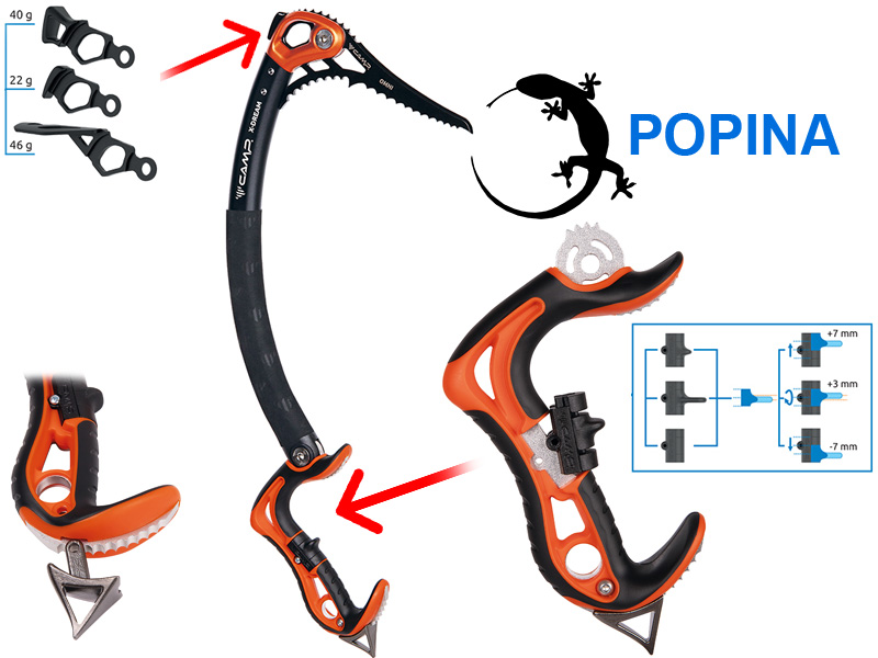 Hlava cepínu je plně konfigurovatelná – lze ji osadit čtyřmi různými hroty, kladivem nebo lopatkou, a také závažími, která lze nastavit nebo odstranit. Základní verze je osazena hrotem Omni, ideálním pro kolmý led a mixové cesty. Kombinuje se s kladivem X-Hammer Lite a 40 g závažími X-Weight, což poskytuje nejlepší výkon na kolmém ledu hned po vybalení. Je možné dokoupit větší kladivo nebo lopatku.
